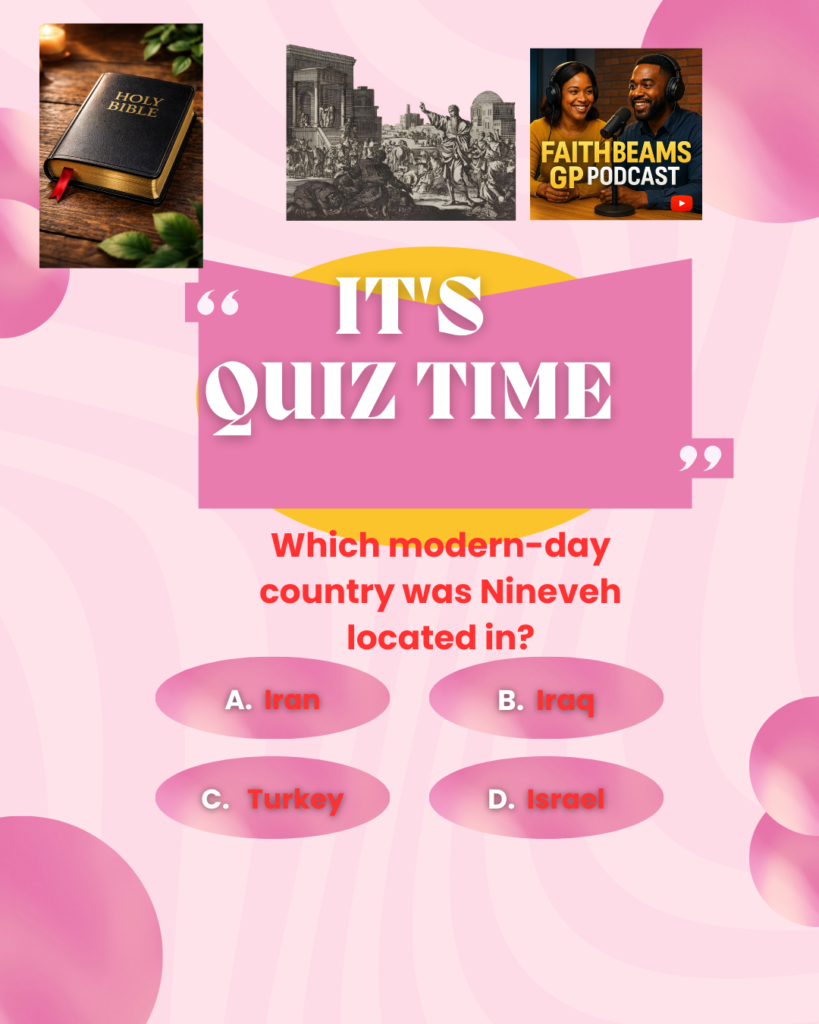 Pop Quiz petrina Graypetrina Gray| Categories: Home Quiz Which modern-day country was Nineveh located in? Leave a Reply Cancel replyYour email address will not be published. Required fields are marked *Comment * Name * Email * Website Save my name, email, and website in this browser for the next time I comment. Post navigation PREVIOUS Previous post: Blog 4NEXT Next post: Trivia Pop Quiz